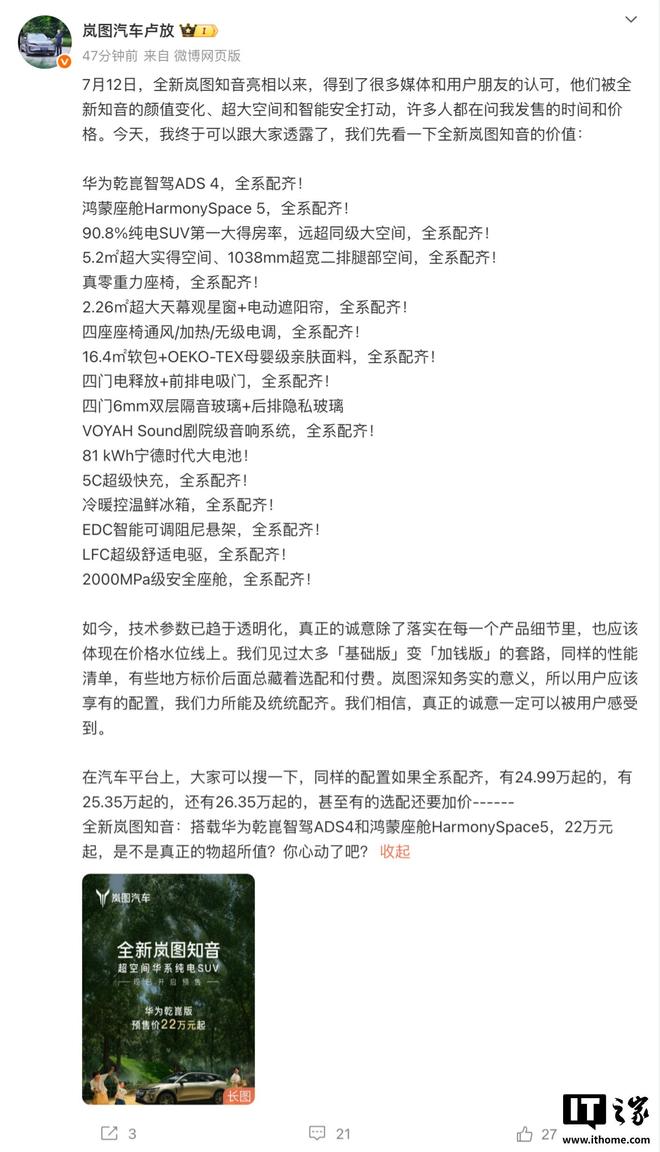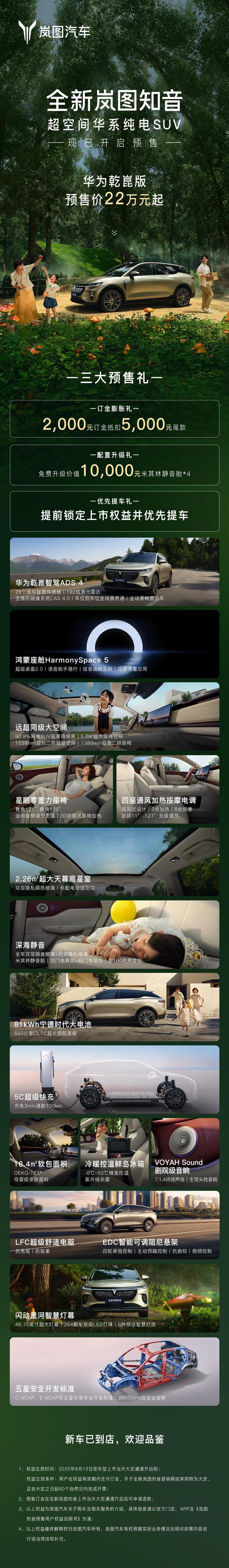 IT之家 8 月 13 日消息,岚图汽车科技有限公司 CEO 卢放今天上午宣布,全新岚图知音今起正式开启预售,新车定位超空间华系纯电 SUV,华为乾崑版预售价为 22 万元起。