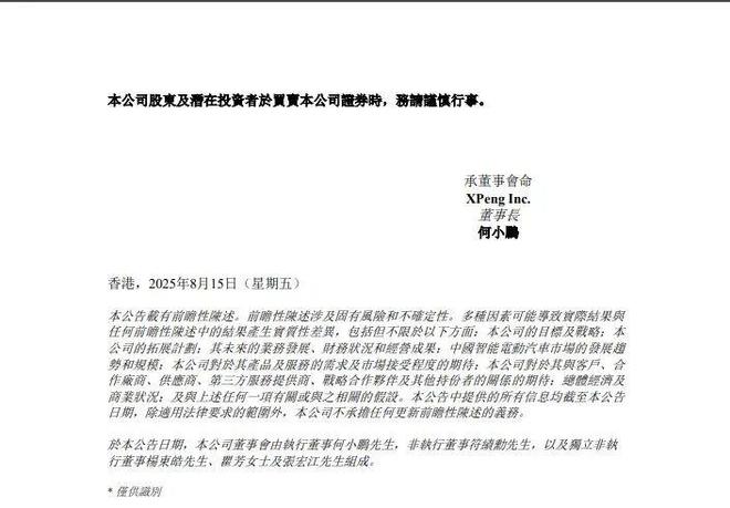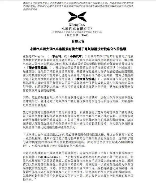 8月15日早间,小鹏汽车(HK09868)在港交所公告,公司与大众汽车集团共同宣布,继双方于2024年7月22日签订电子电气架构技术战略合作联合开发协议后,基于双方对于扩大电子电气架构的应用范围,在大众集团实现跨平台跨动力能源形式的电子电气架构平台化的共识,双方已签订扩大电子电气架构技术战略合作的协议。