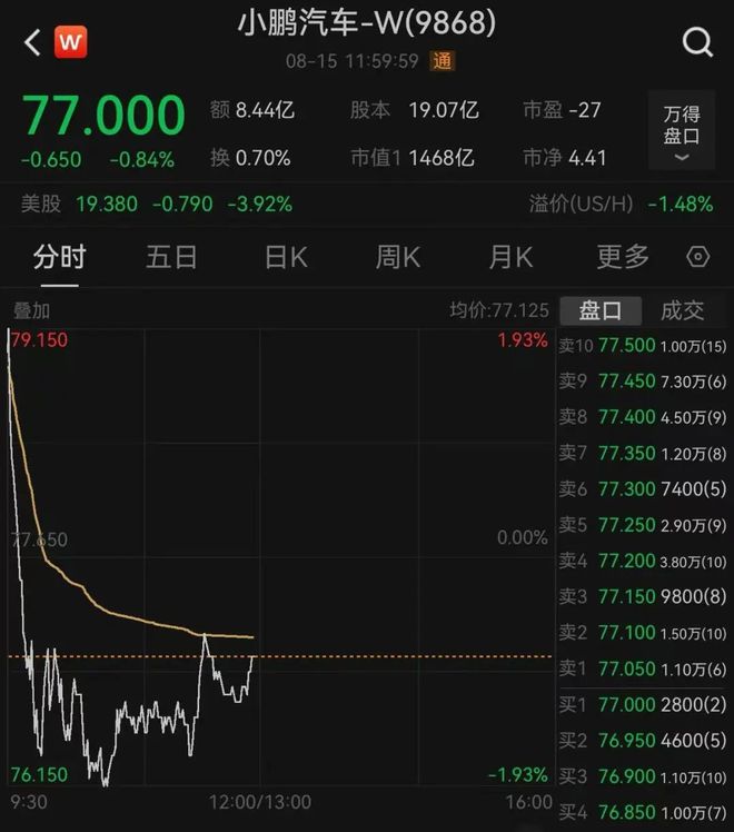 截至8月15日午间收盘,小鹏汽车股价跌0.84%,报77港元,市值1468亿港元。
