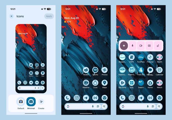 谷歌为应用图标引入了“最小化”主题选项,对于支持主题的应用,会应用完整的主题效果;而对于不支持的应用,则会添加一些颜色以适配主题。例如,像 Pokémon Go 和 FordPass 这样的应用会显示蓝色色调,但不会完全应用主题。