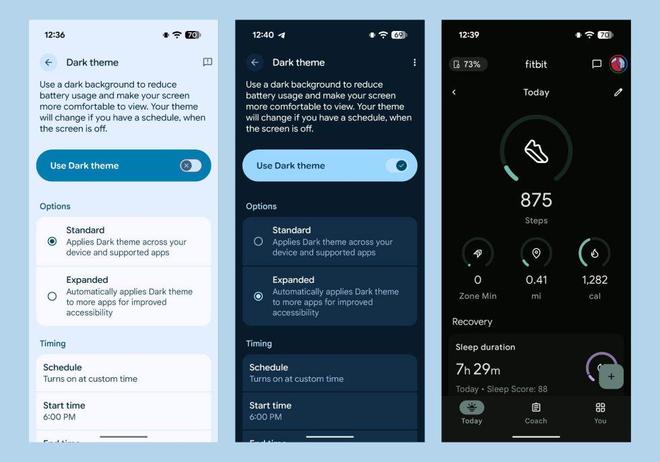 QPR2 在深色主题设置中新增了“扩展”选项,能够自动为更多应用启用深色主题,以提升无障碍体验。尽管许多应用已经支持深色模式,但像 Fitbit 这样的应用此前一直未提供深色主题支持。现在,用户可以通过 QPR2 自行应用深色主题。