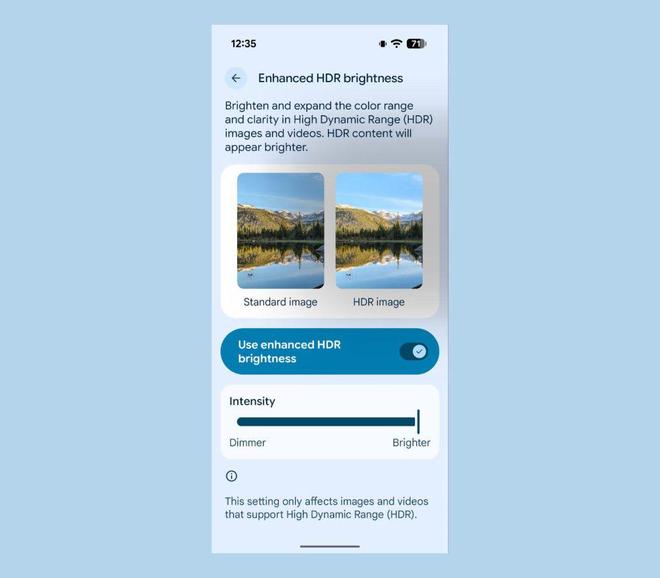 QPR2 在显示设置中新增了“HDR 亮度增强”选项,能够提升高动态范围(HDR)图像和视频的亮度、色彩范围和清晰度。在 Pixel 9 Pro 上,启用该功能后,HDR 内容会显得更亮,用户还可以通过滑块调整亮度增强的强度。