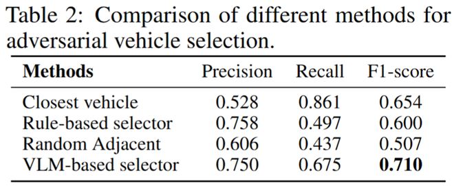 如下图所示,在对抗车辆选择任务中,VLM关键车辆选择器通过多视角画面推理交通关系,有效的分析场景并且选择了合适的安全关键车辆。
