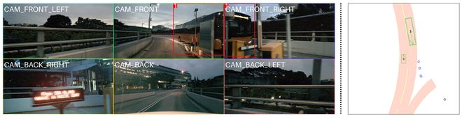 如下图所示,右图展示的是非视觉信息即数据集标注,失去了对于安全关键车辆信息判断至关重要的障碍物标注,导致传统的启发式规则方法错误判断认为大巴可以与自车发生自然轨迹的碰撞,实际上其并无法绕过障碍物与自车发生碰撞。