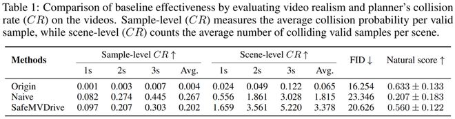 在碰撞率指标上,它生成的场景比开源数据集中自然轨迹用于多视角视频生成模型(Origin)更具挑战性,且在保持高碰撞率的同时,画质与真实感依然接近真实视频,远优于将碰撞轨迹模拟生成的轨迹直接与多视角视频生成模型结合生成的视频(Naive)。