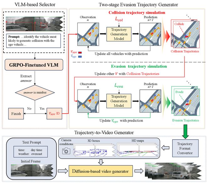 它将VLM关键车辆选择器与两阶段轨迹生成结合,驱动多视角视频生成模型,在真实域中实现批量制造高保真安全关键视频,可用于对端到端自动驾驶系统的安全性测试。