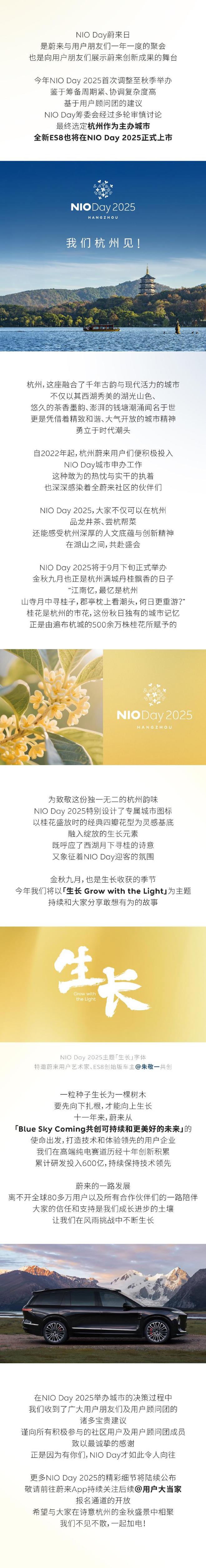 今日蔚来官方宣布NIO Day 2025将在杭州举办。本次NIO Day将以「生长 Grow with the Light」为主题,全新ES8将正式发布交付。据介绍,NIO Day 蔚来日,是蔚来与用户朋友们一年一度的聚会,也是向用户朋友们展示蔚来创新成果的舞台。基于用户顾问团的建议,NIO Day 筹委会经过多轮讨论,最终选定杭州作为主办城市,并将于9月下旬正式举办。