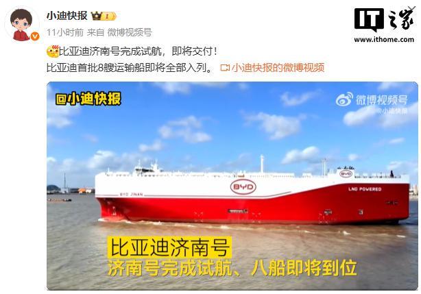 IT之家 8 月 25 日消息,博主 @小迪快报 今日透露,比亚迪济南号完成试航,即将交付,比亚迪首批 8 艘运输船即将全部入列。