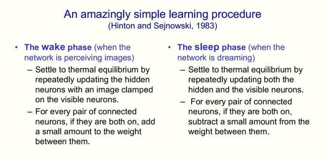 而在「玻尔兹曼机」中,学习的目标,就是要确保当网络生成图像时,本质上可以称为「做梦、随机想象」,这些与它在「清醒」时感知真实图像所形成的印象相吻合。