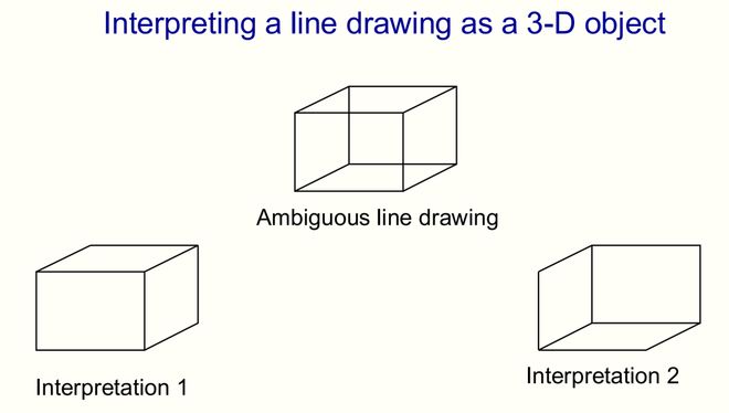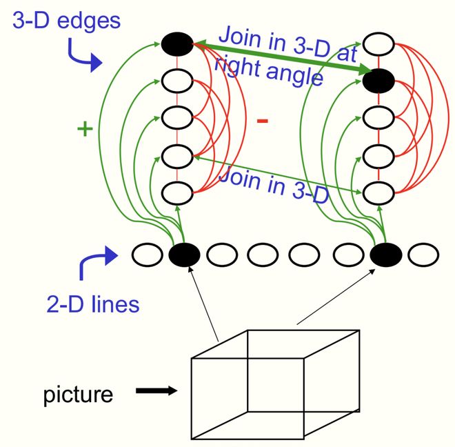 Hinton以一幅经典的模棱两可的线条画——内克尔立方体(Necker cube)为例,展示了网络如何处理视觉信息的复杂性。