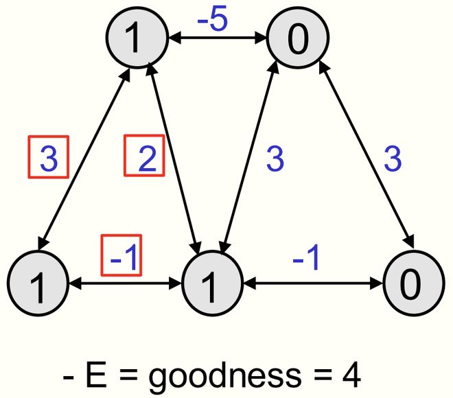 这便是该网络配置的优度,而能量(energy)是优度的负值。