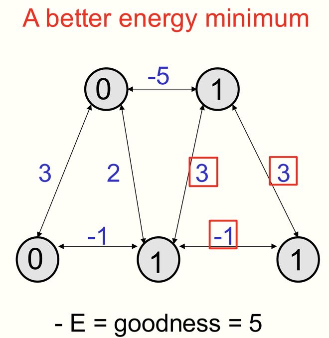 如下,便是一个更优的能量最低点。开启右边神经网络,其优度是3+3-1,能量为-5。