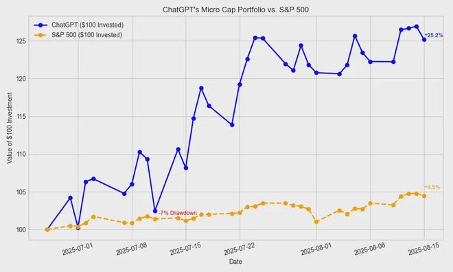 转眼间,GPT-4o 已操盘近两个月。数据显示,从 6 月 30 日至 8 月 15 日,GPT-4o 的投资组合累计上涨了 25.2%,而同期的标普 500 指数仅上涨了 4.5%。更让史密斯惊叹的是,GPT-4o 时不时就会出现“神操作”。例如,在第四周,它决定将从 Candel 医药公司获得的收益转投给专注癌症和炎症疗法的 Actuate 医药公司,结果当周股价就暴涨 27.37%。