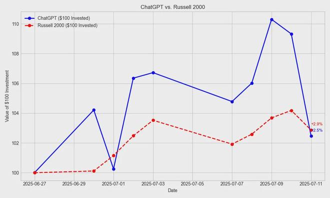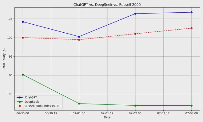 结果,短短一周后,两位“AI 股民”的成绩就拉开了巨大差距。DeepSeek 的表现令人大跌眼镜,仅用 5 天就让资产缩水了 18.06%;GPT-4o 首周的收益率却达到了惊人的 6.72%,甚至跑赢了罗素 2000 指数(Russell 2000 Index,被视为美国小型股市场的风向标)。GPT-4o 选中的其中一只股票涨幅更是高达 12%。