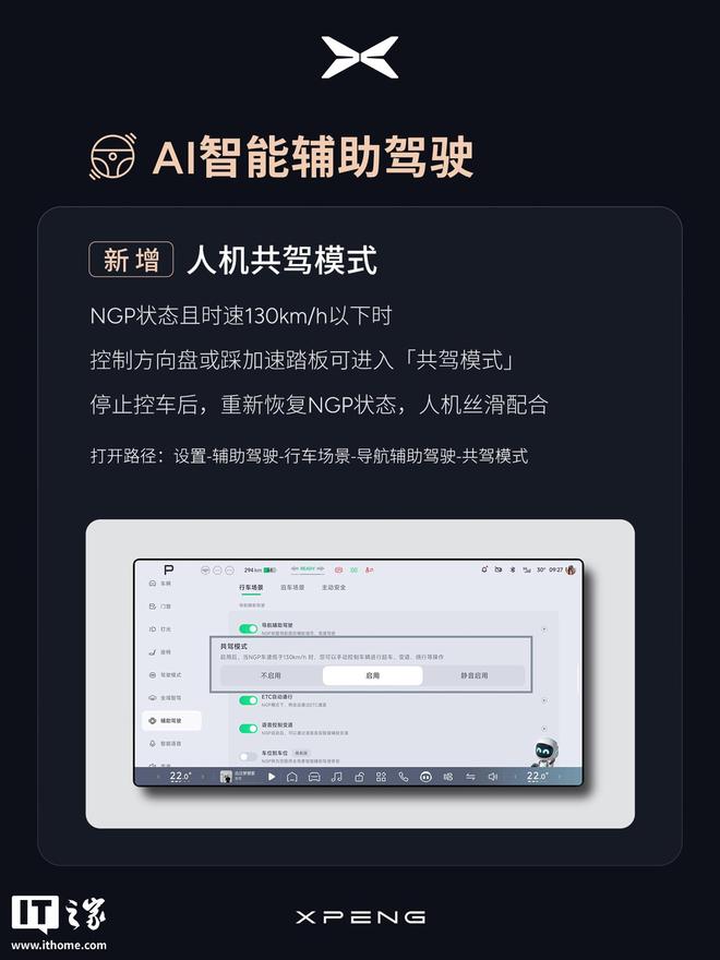2、人机共驾模式:在 NGP 状态下,当车速低于 130km/h 时,驾驶员可以通过控制方向盘或踩加速踏板进入共驾模式,实现人机无缝配合。