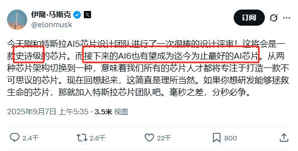 据财联社9月7日报道,特斯拉CEO马斯克在社交媒体发帖称,刚和特斯拉AI5芯片设计团队完成一场非常出色的设计评审,称这款芯片将成为“史诗级”产品,且紧随其后的AI6芯片有望成为迄今为止最出色的AI芯片。