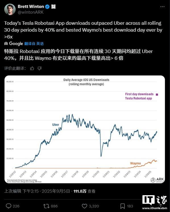 方舟投资(ARK Invest)的布雷特・温顿指出,特斯拉 Robotaxi 应用的首日下载量在所有连续 30 天期间均超过 Uber 40%,并且比 Waymo 有史以来的最高下载量高出 6 倍。