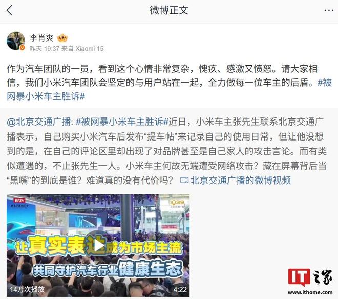 IT之家注意到,小米汽车副总裁李肖爽昨日转发了该消息,并回应称小米汽车团队会坚定的与用户站在一起。