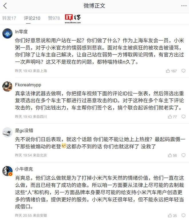 评论区中有网友给李肖爽提出了建议,称把提车视频下面的评论 ID 拉一张表,然后筛选出重复项并选出在多个车主下都进行过恶意攻击的 ID。对于这种在多个车主下评论攻击的,小米出钱出力、车主进行签名,对他们发起联合起诉。