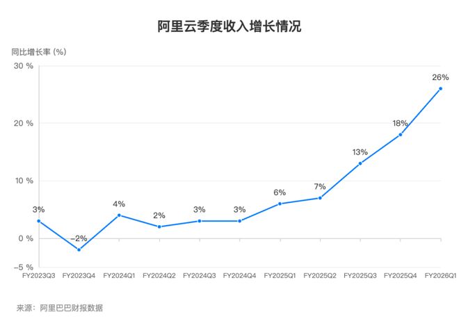 最关键的指标是收入。最新财报显示,阿里云季度收入同比增长26%,创下三年来的新高,彻底走出了此前仅3%的低速增长泥潭,呈现出清晰的U型反弹。