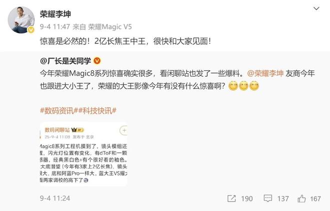 此外荣耀旗舰手机产品经理李坤此前也在讨论 Magic8 系列的微博中回复网友称“惊喜是必然的!2 亿长焦王中王,很快和大家见面!”