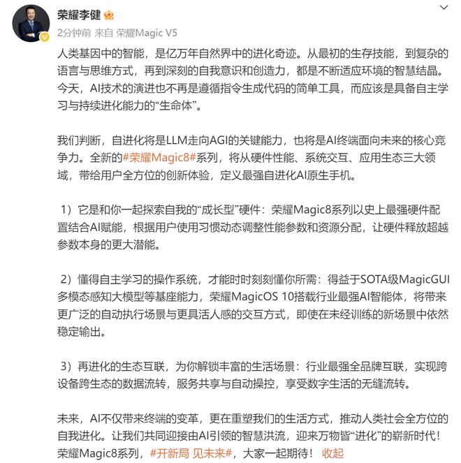 说到 AI,早在 9 月 8 日,荣耀 CEO 李健微博预热 Magic 8 系列时就表示,荣耀 Magic 8 不仅是一部 AI 手机,更是一款以全面自进化能力开启全新局面的“新时代 AI 手机”。