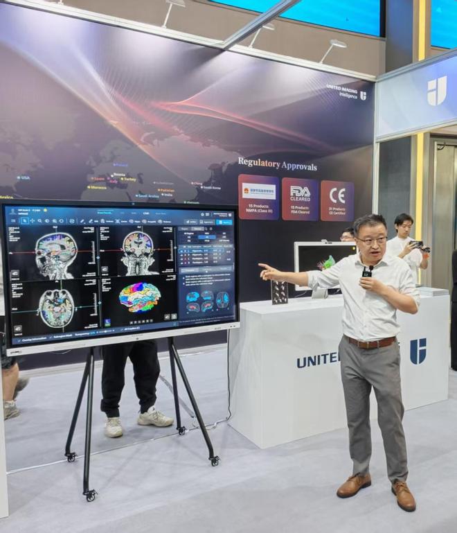 联影智能联席CEO周翔现场为参观的跨国企业介绍AI+医疗