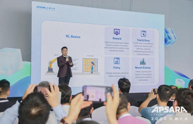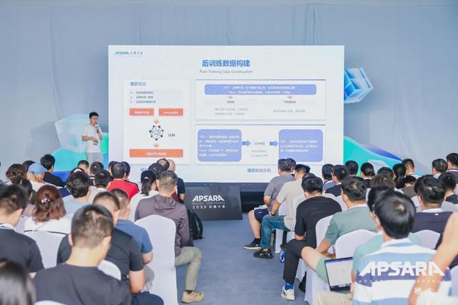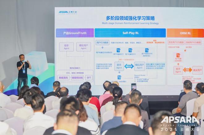 △图:网易伏羲语言智能组负责人张荣升在云栖大会《大模型后训练:打造企业专属智能引擎》论坛分享。