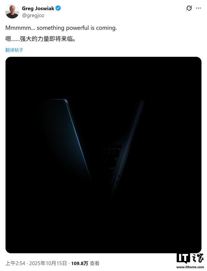 IT之家 10 月 15 日消息,科技媒体 MacRumors 昨日(10 月 14 日)发布博文,报道称苹果公司营销主管格雷格・乔斯维亚克(Greg Joswiak)发布官方预告,称“强大的新品即将到来”,其配图动画通过“V”字形轮廓(罗马数字 5)和配文中的五个“M”巧妙指向了新一代 M5 芯片。