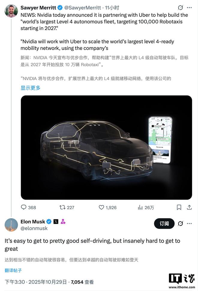 IT之家 10 月 29 日消息,今天下午,马斯克回应“英伟达与优步合作共建世界最大规模 L4 自动驾驶车队”有关的新闻称,自动驾驶达到“相当不错(pretty good)”的水平很容易,但达到“卓越(great)”的水平却相当困难。