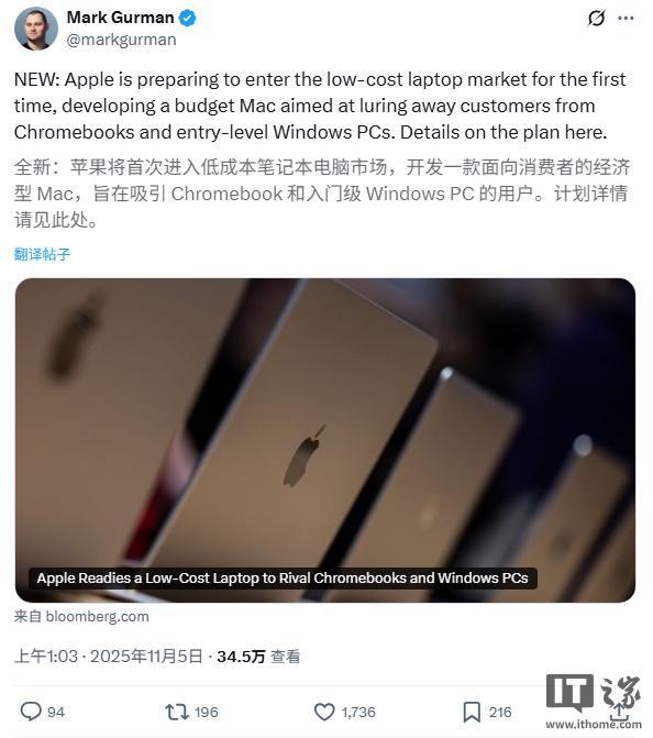 IT之家 11 月 5 日消息,彭博社记者马克・古尔曼今日报道称,苹果公司正计划进军低价笔记本电脑市场,这将是其首次推出面向大众价位的笔记本产品。苹果发言人对此未予置评。