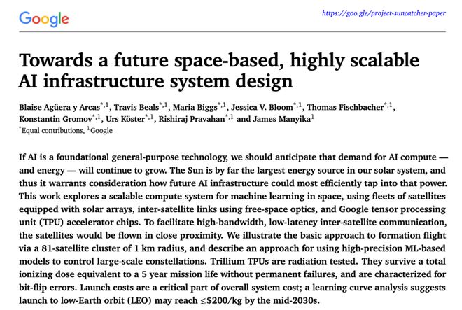 谷歌今天已经发表了预印本论文《 面向未来高度可扩展的天基人工智能基础设施系统设计 》,揭秘了一些早期研究成果