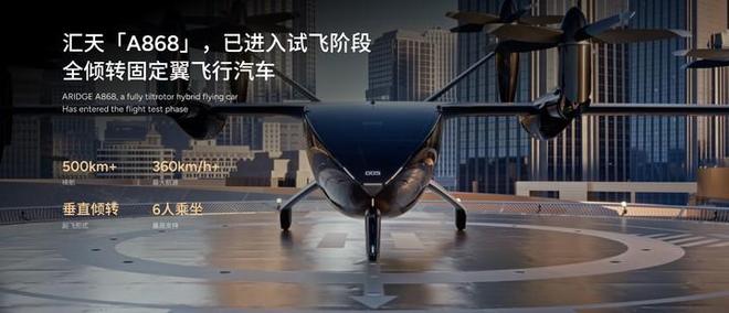 「A868」采用全倾转旋翼构型,基于小鹏汽车鲲鹏超级增程架构,搭载自研航空级混电内核,预计实现 500 公里航程,最高航速达 360 公里/小时,采用 6 人座舱设计,瞄准高端商务与城际通勤需求。