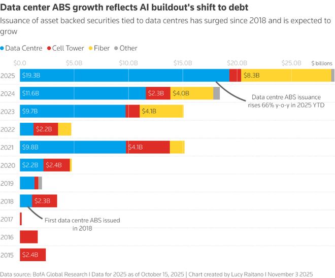 美国银行指出,虽然数字基础设施目前仅占约1.6万亿美元美国ABS市场的5%(约800亿美元),但在不到五年的时间里,其规模已扩张超过八倍。该行估计,数据中心为其中64%的交易提供了支持,并预计在数据中心建设的推动下,到明年年底,这一市场规模将达到1150亿美元。ABS本身是标准的融资工具,但因其在2008年金融危机中扮演的角色而至今仍受到审慎看待,当时大量此类产品因底层资产恶化而变得毫无价值,引发了系统性危机。如今,它正被重新用于为新一轮科技革命提供动力。