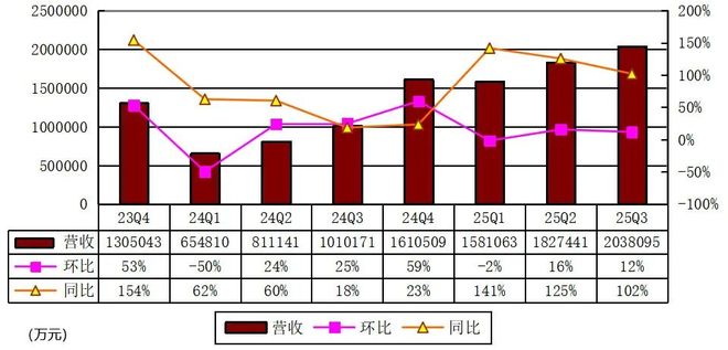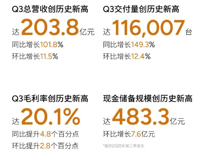 小鹏汽车2025年第三季度总收入203.8亿(28.6亿美元),较2024年同期的101.0亿元上升101.8%,较2025年第二季度的182.7亿元上升11.5%。
