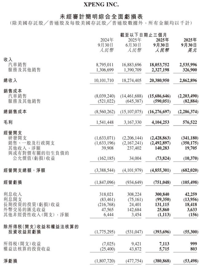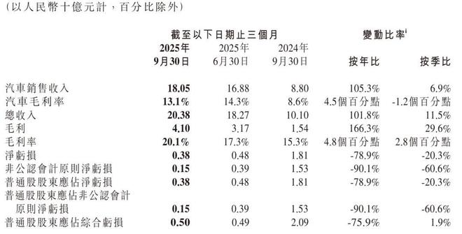 小鹏汽车2025年第三季度汽车销售收入180.5亿元(25.4亿美元),较2024年同期的88.0亿元上升105.3%,并较2025年第二季度的168.8亿元上升6.9%。按年及按季增长主要由于新推出的车型交付量增加所致。
