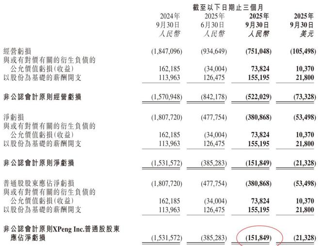小鹏汽车2025年第三季非公认会计原则经营亏损(不包括以股份为基础的薪酬开支及与或有对价有关的衍生负债的公允价值亏损(收益))为5.2亿元(0.7亿美元),2024年同期为15.7亿,而2025年第二季度为8.4亿元。