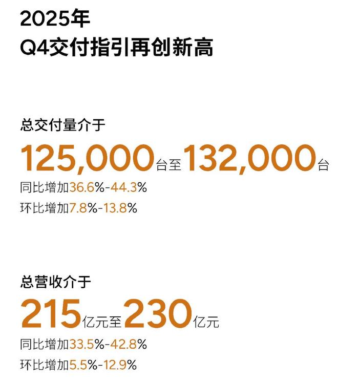 小鹏汽车预计2025年第四季度汽车交付量将介乎125,000至132,000辆,按年增加约36.6%至44.3%;总收入将介乎215亿元至230亿元,按年增加约33.5%至42.8%。