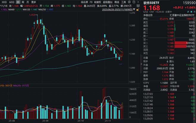 今日(11.18),软件板块再度强势,软件50ETF(159590)涨超1%冲击二连阳,盘中成交额逼近3000万元,再度放量!资金面上,软件50ETF(159590)盘中再度“吸金”,近20日累计净流入超8200万元!