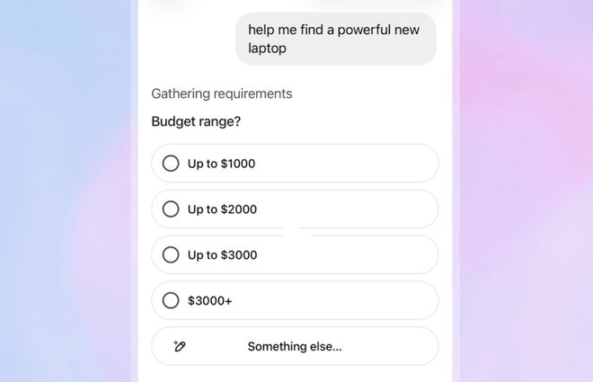 用户可以通过聊天界面中的专用“购物研究”按钮启动该功能,并用“为一间单身公寓找一个小沙发”或“为我4岁的侄女挑选一份热爱艺术的礼物”等指令描述需求。