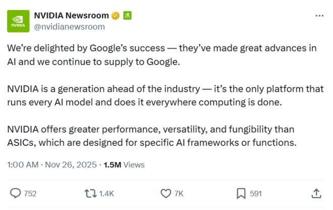 11月26日凌晨1点,英伟达罕见发布紧急声明,回应近期市场对AI硬件发展路线的热议。业界普遍认为,此举与谷歌第七代Ironwood TPU正式上市,以及Meta考虑采用TPU方案等行业动态密切相关。