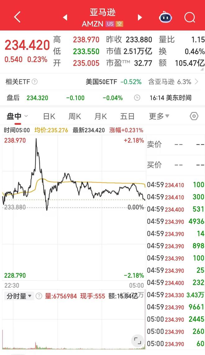 新AI芯片的消息公布后,亚马逊股价盘中一度涨超2%,截至收盘报234.42美元,涨幅0.23%,市值2.51万亿美元。