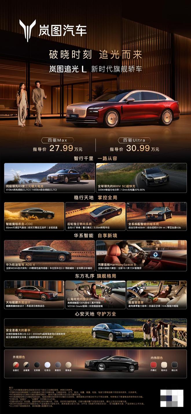 IT之家 12 月 10 日消息,岚图追光 L“新时代旗舰轿车”今晚正式上市,新车全系标配华为乾崑智驾 ADS 4 和鸿蒙座舱 5.1,提供两种不同配置,售价区间为 27.99 万-30.99 万元。