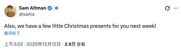 公司CEO奥尔特曼在周四宣布,下周会给用户们带来一些“小小的圣诞礼物”。他也在周四表示,Gemini 3对公司各项指标的影响比原本担心得要小。他还说,预计OpenAI将在明年1月“以非常强劲的姿态”退出目前的红色警报状态。