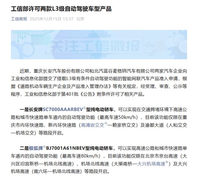 12月15日,据工业和信息化部官方公众号消息,我国首批L3级有条件自动驾驶车型准入许可公布,两款分别适配城市拥堵、高速路段的车型将在北京、重庆指定区域开展上路试点,意味着我国L3级自动驾驶从测试阶段向商业化应用迈出了关键一步。