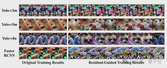 上图可视化了一些目标模型的补丁生成结果。左侧是没有残差引导训练时,可以观察到所有四个目标模型生成的补丁都是相同的。
