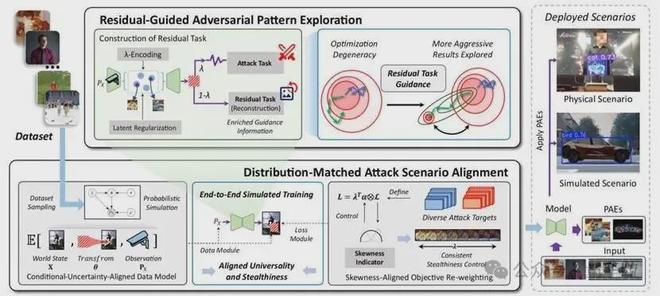 DynamicPAE框架如图1所示,主要包括残差驱动的对抗模式探索方法与分布匹配的对抗场景对齐方法,解决了端到端训练动态对抗样本生成器时的模式易坍缩、环境难适配问题。论文首先将动态物理对抗样本生成问题定义为: