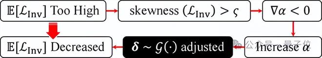 为建立攻击目标权重配比自适应调控机制,并针对原残差任务中的LInv进行调节,设定重构任务的损失强度α和新损失L’Inv,根据损失的偏度统计量作为指示器,定义新损失项L’Inv及其调节方程为: