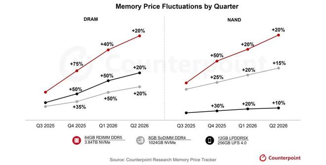 Counterpoint 最新预测显示,去年 Q4 存储价格已大幅上涨 40%–50%,今年 Q1 仍将再涨 40%–50%,Q2 预计继续上涨约 20%。