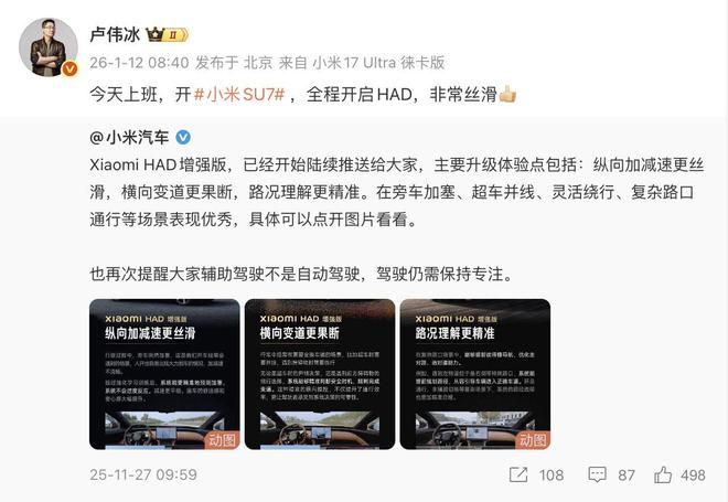 小米总裁卢伟冰辟谣辞职:开 SU7 上班,HAD 非常丝滑